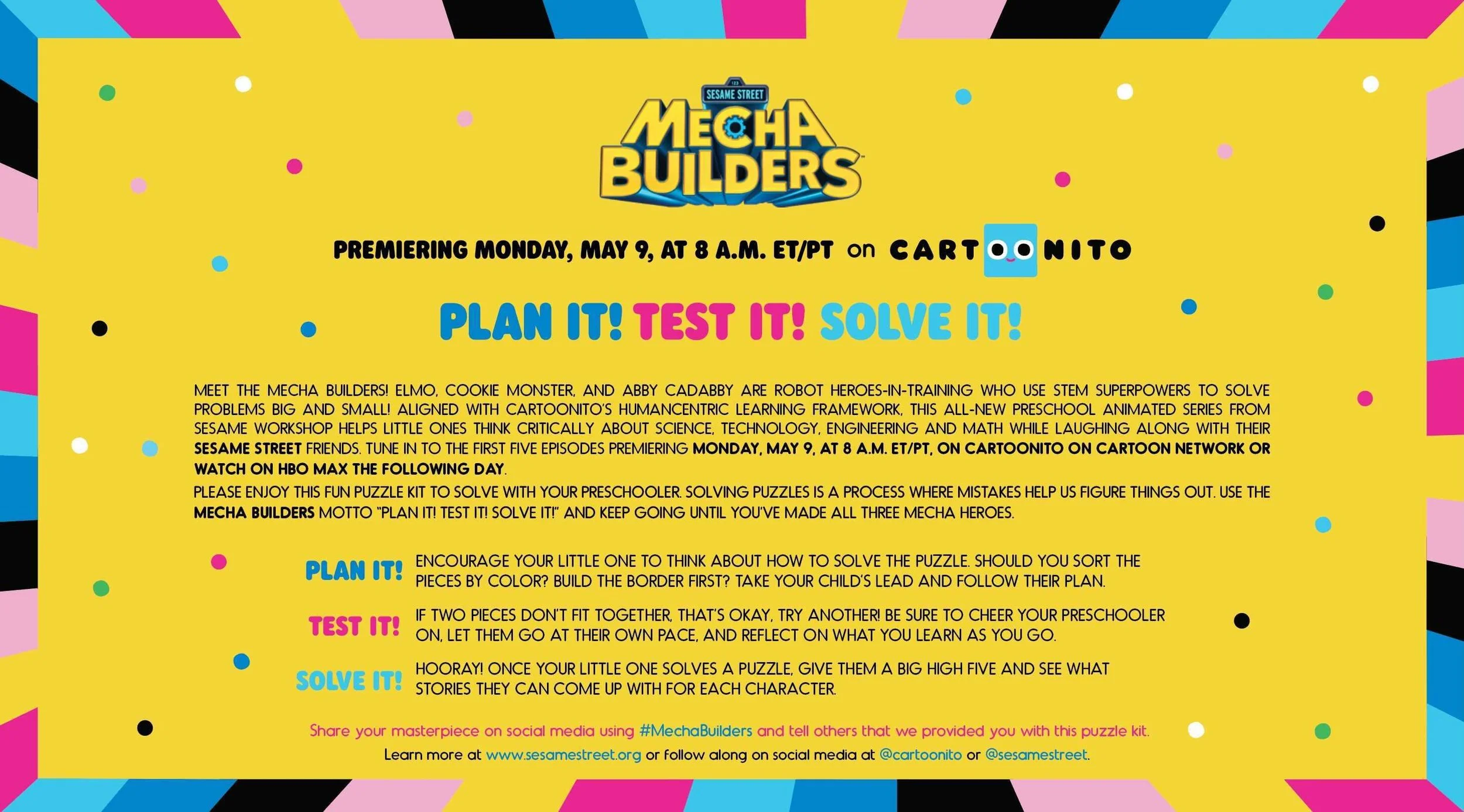 Objective - Create a press kit for the premier of Sesame Street Mecha Builders. Includes a show write-up and three character puzzles.
